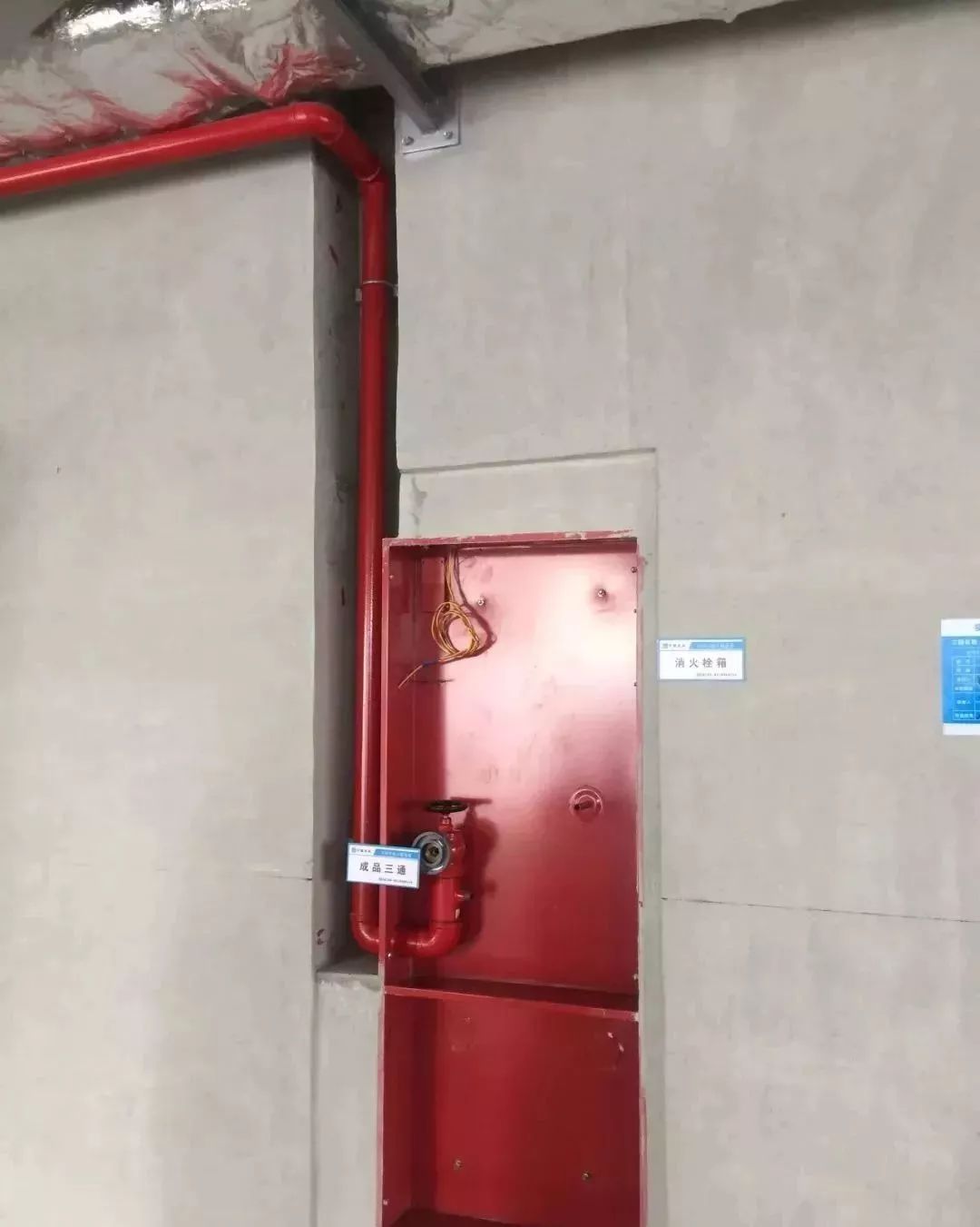 消火栓箱安裝,箱體外填塞密實,管道安裝垂直,栓頭距地1.1米。