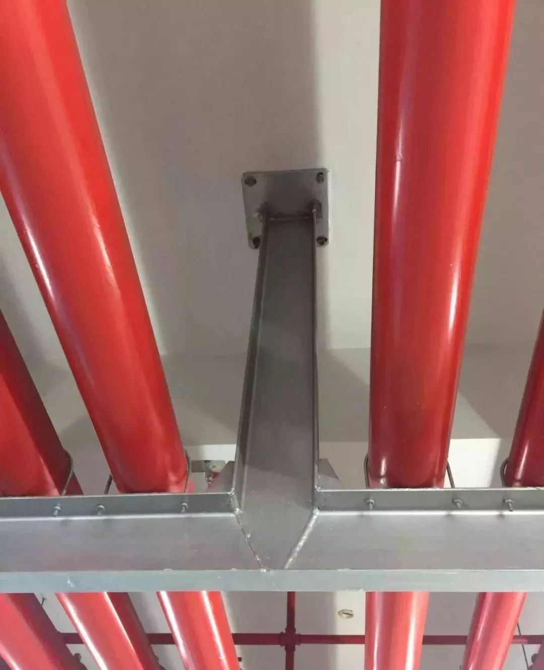 槽鋼支架選型正確,加工45度角切割煨彎焊接,吊桿布置合理,端頭雙螺栓固定,管卡型鋼機械開孔。
